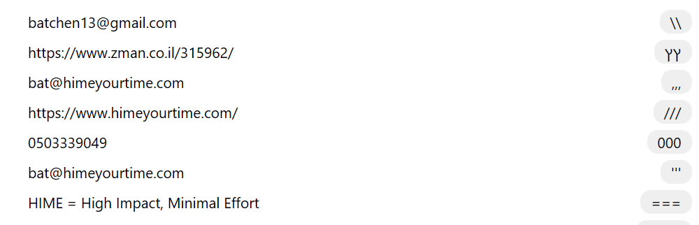 Search for Alfred tool , pin it, then start creating 3 snippets that will be most often used.